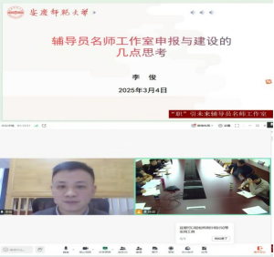 会上,李俊老师主要从名师工作室申报应把握的基本原则、申报书撰写注意事项及名师工作室运行规则等三个方面进行分享,并就辅导员工作实践相关问题和与会辅导员代表进行现场交流。此次专题辅导会是安徽省“职”引未来辅导员名师工作室建设的重要内容,将进一步加强名师工作室与省内重点高校之间的实践经验交流与共享,进一步促进名师工作室系列创新理念及成果的传播和推广,进一步推动 名师工作室发挥辐射引领作用,共同探讨工作室建设与发展新思路、新策略,为进一步提升育人成效赋能前行。(撰稿:罗文慧 审核:詹德全)