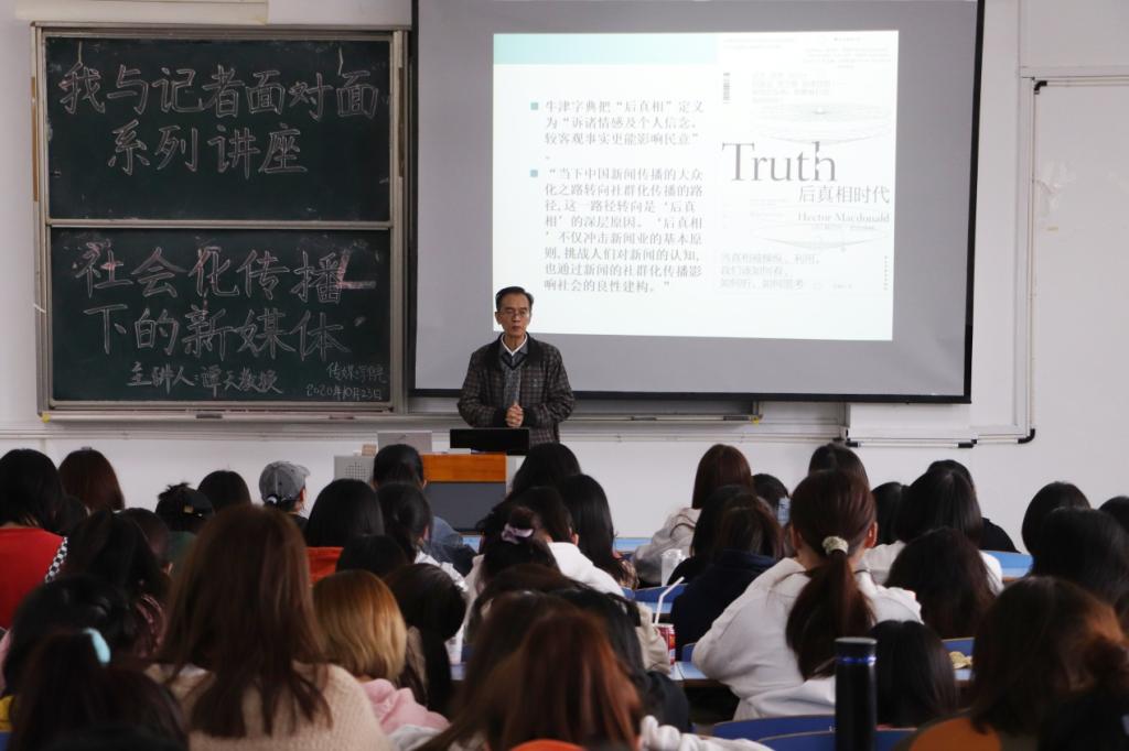 讲座上,谭天教授基于现实案例,从人类发展与媒体的演变、对媒体的介绍、互联网时代、大众传播与人际传播四个方面,讲述新媒体给人们带来的改变。