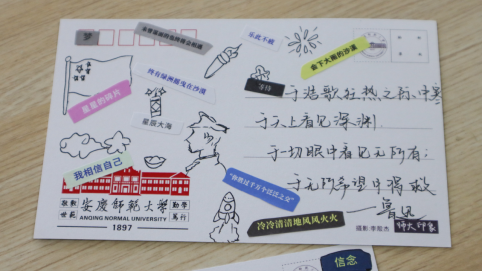 低头沉思、挥毫泼墨、轻声诵读……学生们自主选取诗歌素材,通过裁剪拼贴的方式,将诗句粘贴在明信片上,最终创作出各具特色的拼贴诗,在诵读中表达对革命先烈的崇敬与怀念。