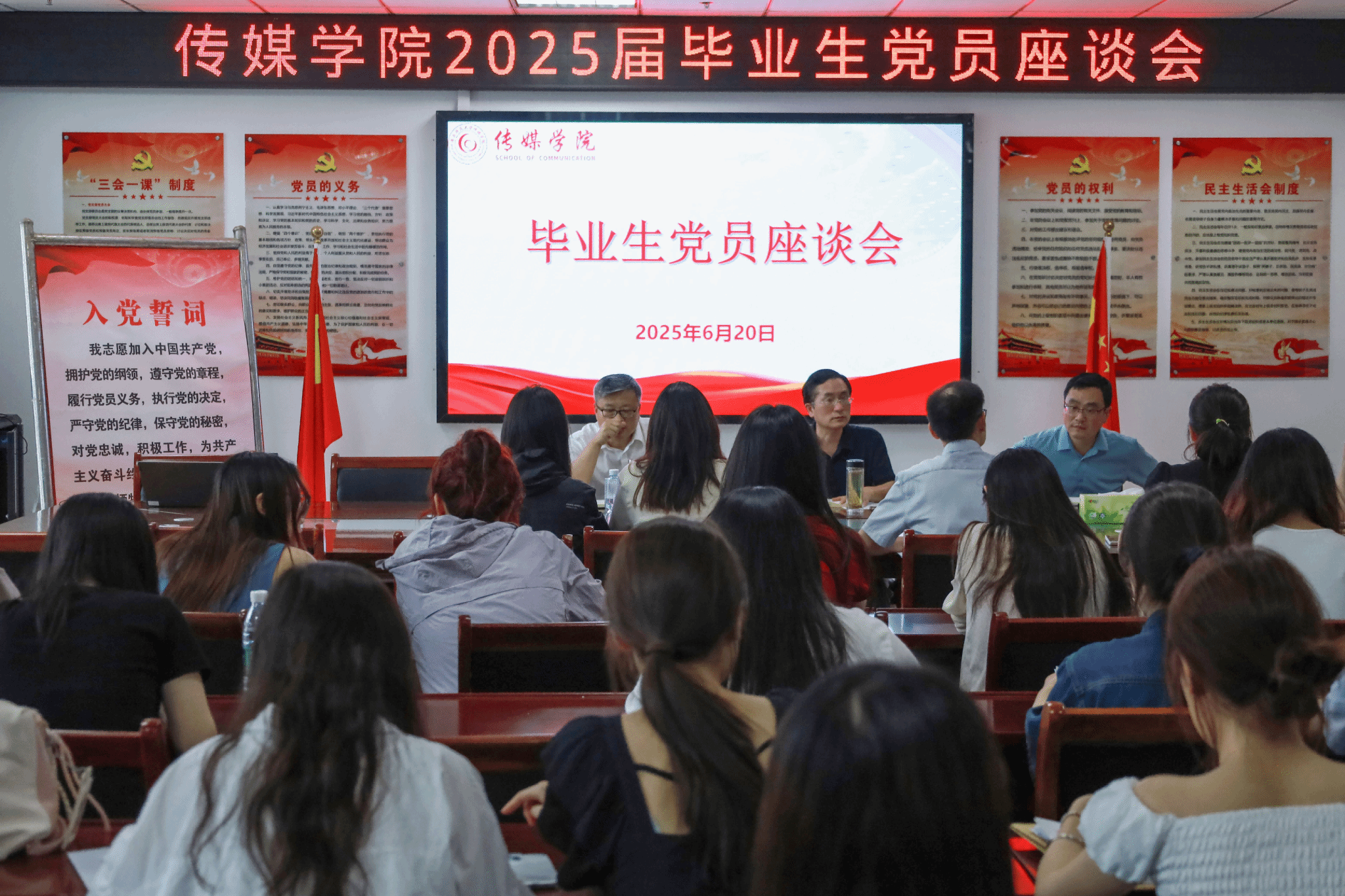 6月20日,夫妻论坛 于夫妻论坛 408会议室举办毕业生党员座谈会。夫妻论坛 党委书记詹德全、执行院长王业明、副院长文继奎出席会议。全体学生党支部书记、全体毕业生党员参加会议,党委书记詹德全主持座谈会。