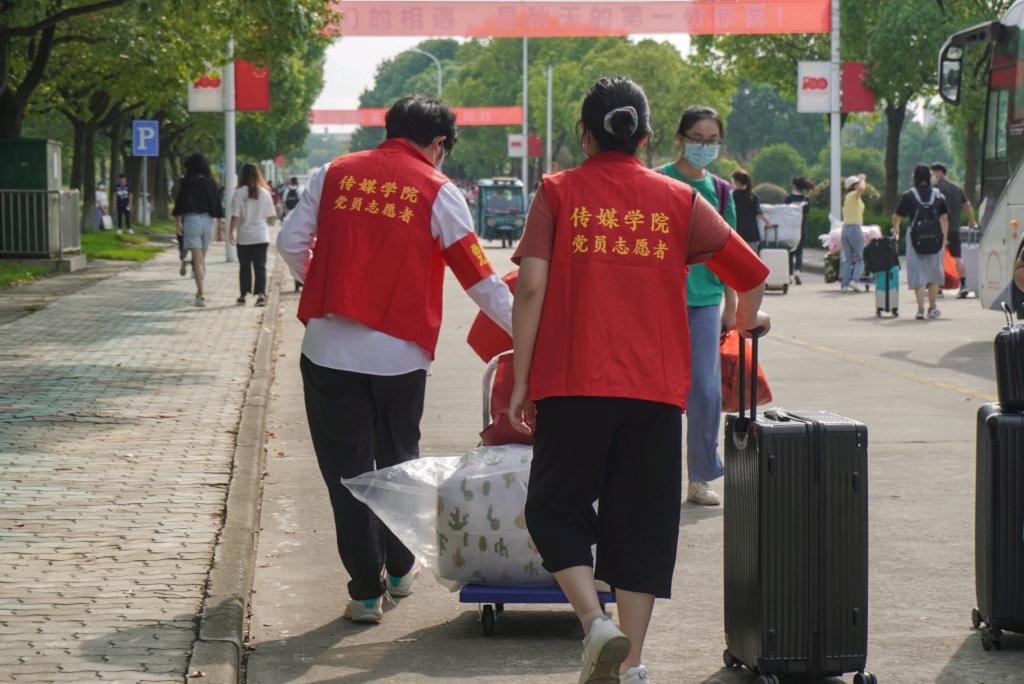 的40余名党员组成迎新志愿服务队,他们佩戴党员徽章、身着红色马甲,积极走上迎新岗位,接过新生手中沉甸甸的行李箱,指引新生有序报到,穿梭在熙来攘往中,成为了一抹红色的校园风景线。