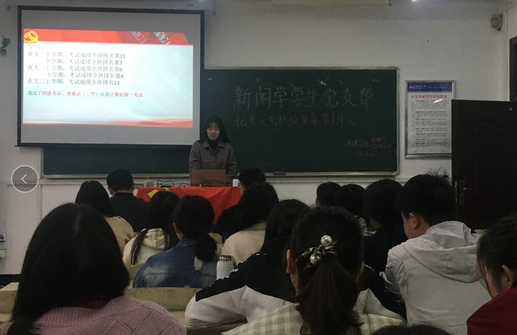 新闻学学生党支部和广播电视学学生党支部分别在文渊楼101和文渊楼304举行优秀入党积极发展答辩会。答辩会由各学生党支部负责老师主持。各党支部成员及学生代表担任此次答辩会评委。