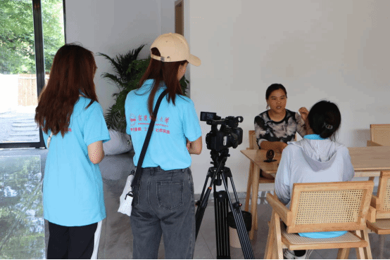 石头铺满民宿小院,稻草作亭子装饰,实践团成员走到延伸台远眺,眼睛瞬时就被满山的绿意遮掩了起来。3人负责拍摄民宿风光,1人负责进行镜外访谈,2人负责记录采访过程……从餐厅、客房、后厨到户外展台,学生们分工合作,携带摄像设备与采访记录本,跟随岳晓红参观民宿环境的同时,学习网红民宿发展新模式。