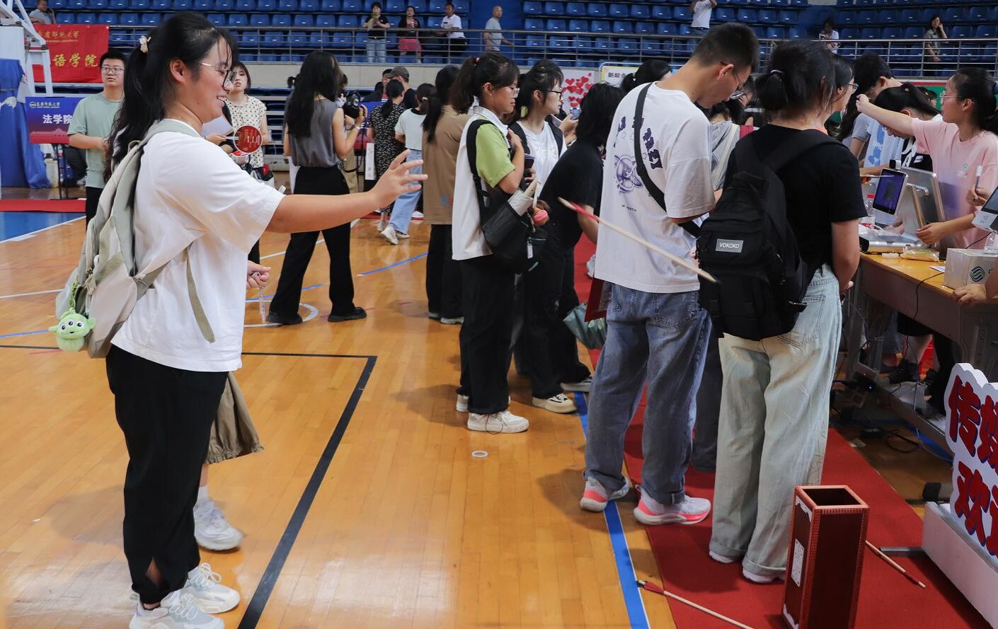 新闻传播学类专业2023(6)班的程俨完成报到后,尝试了投壶游戏。“第一天来学校,还有些拘束,但是玩了这个游戏后,我的心情得到放松。”他表示,游戏结果并不是最重要的东西,玩游戏重在体验。游戏过程中,新生们不断调整自己与投壶的距离和投射的方向,一次又一次投掷着。