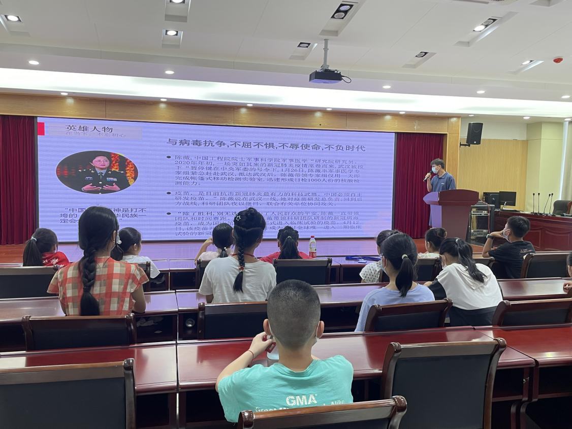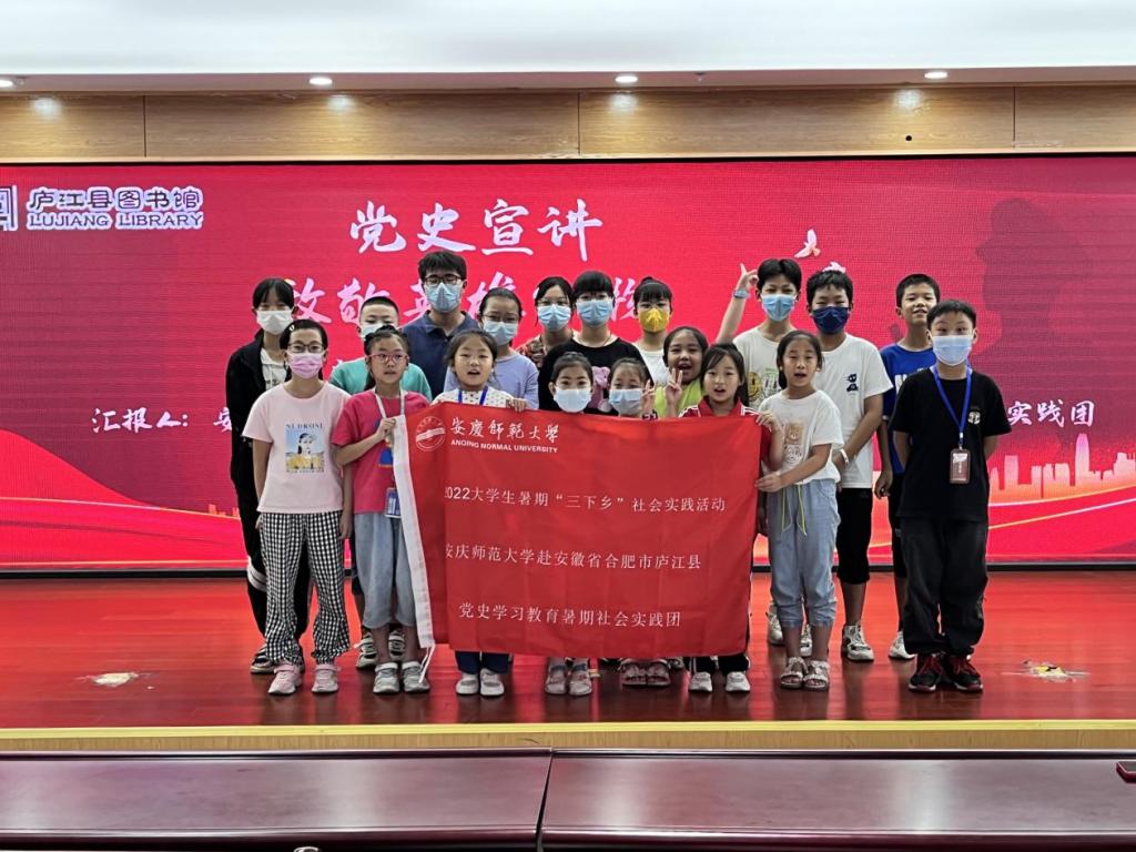 赴庐江县党史学习教育暑期实践团在进行“喜迎二十大,致敬英雄人物”的党史宣讲活动。二十余名学生听众认真聆听着实践团成员讲述的故事,与英雄人物来了场别开生面的“对话”。