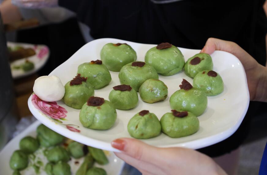 将面皮揉成饼状,加入豆沙或者咸蛋黄,揉成球状,包上保鲜膜,一个小巧玲珑的青团就做好了。张忍龙作为第一个就做好了小青团的学生,俨然成为了这次包青团的“小老师”。“因为家乡有吃青团的习俗,我也做过所以有一定的经验,将自己所会的东西教给大家,也是一件很快乐的事情。”在他的指导下,前来虚心请教的“徒弟们”瞬间做好了一个又一个的青团。