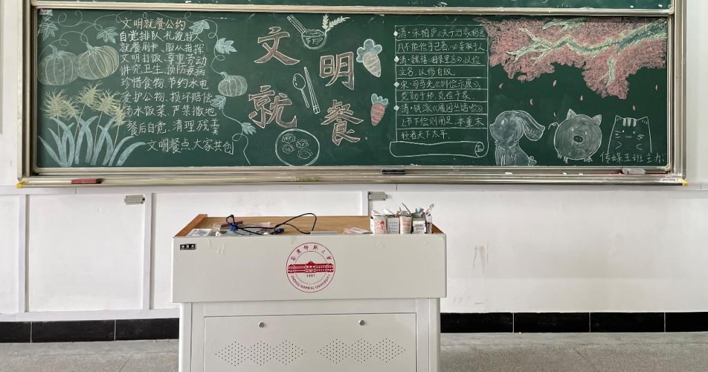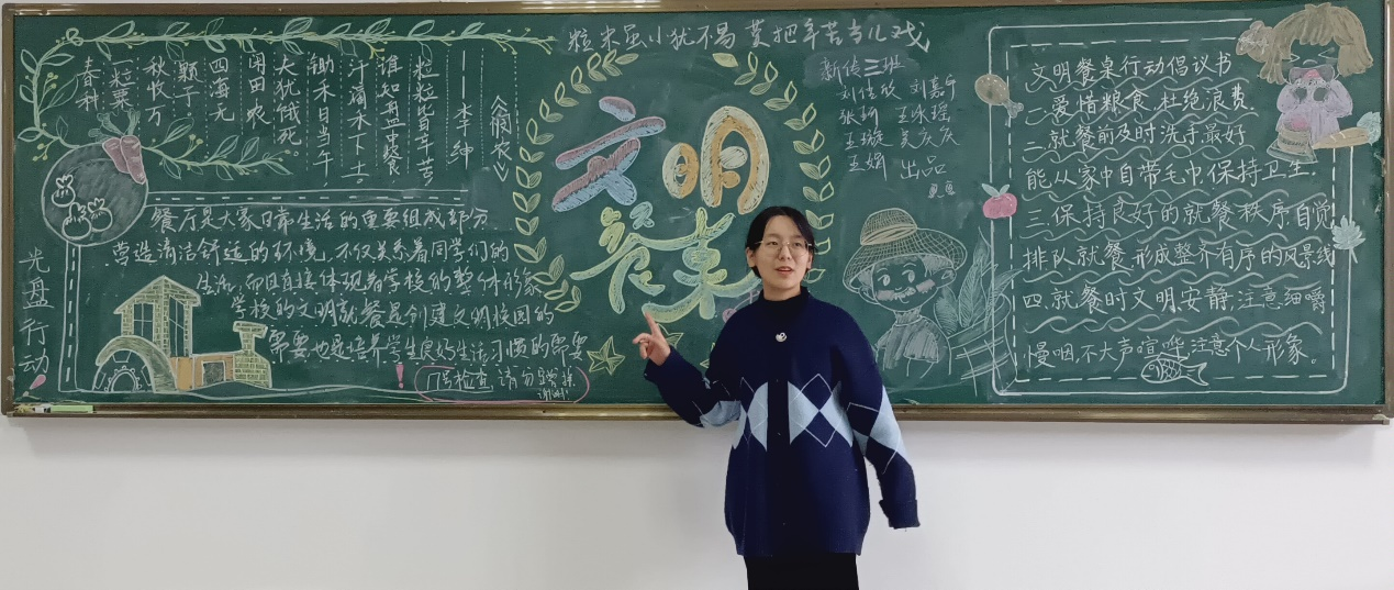 “粒米虽小犹不易,莫把辛苦当儿戏”,这是新闻传播学类2021(3)班的黑板报作品主题。据班级黑板报解说员、新闻传播学类专业2021(3)班的刘佳欣介绍,制作黑板报的学生们克服了资料有限、材料有限等困难,从文字内容、排版、图画三方面入手,着重突出了农民伯伯的形象,并以树叶、麦穗等元素作为辅助。“我们在板报中提出了在餐厅‘文明就餐’的意义,以一首耳熟能详的古诗警示大家,又以倡议书再次倡导大家‘文明就餐’。”