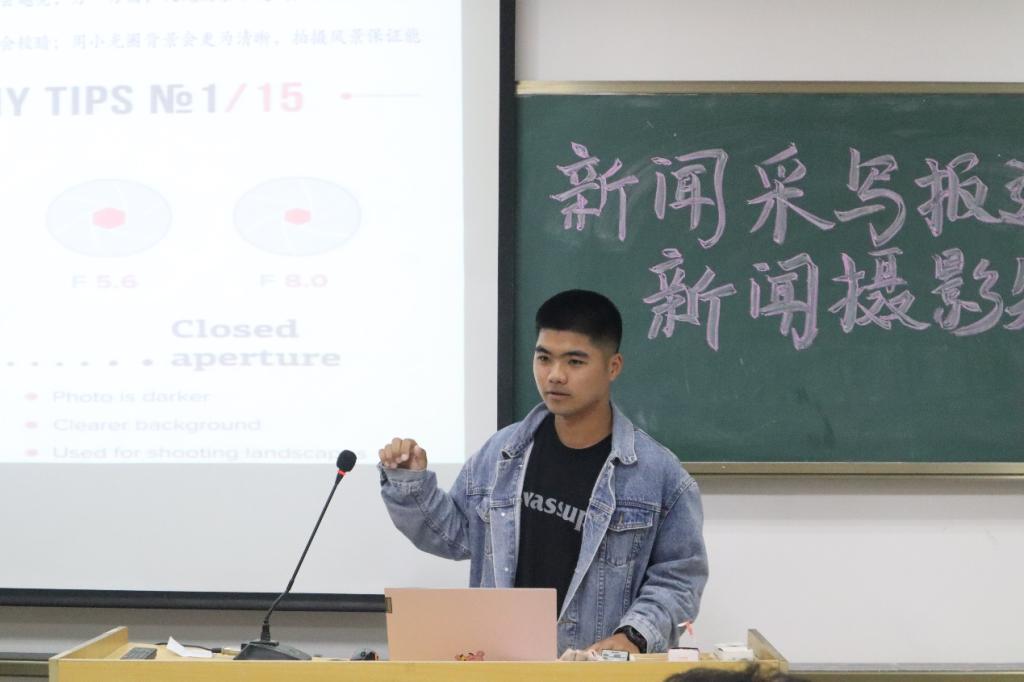 校记者团摄影记者徐辉浩以几张自己亲手拍的摄影图片开始了本次培训会,他从常见新闻题材拍摄、摄影构图原则、摄影技巧和新闻图片的文字说明四个方面,讲解新闻摄影的相关知识和注意事项。他向大家讲解了新闻摄影的具体含义,普及了光圈、快门和ISO感光度等摄影专业知识,介绍了常见的新闻题材拍摄方法,分享了自己的拍摄经验。“要热爱摄影,提高自己的审美,记住新闻摄影要有文章意识。”徐辉浩说。