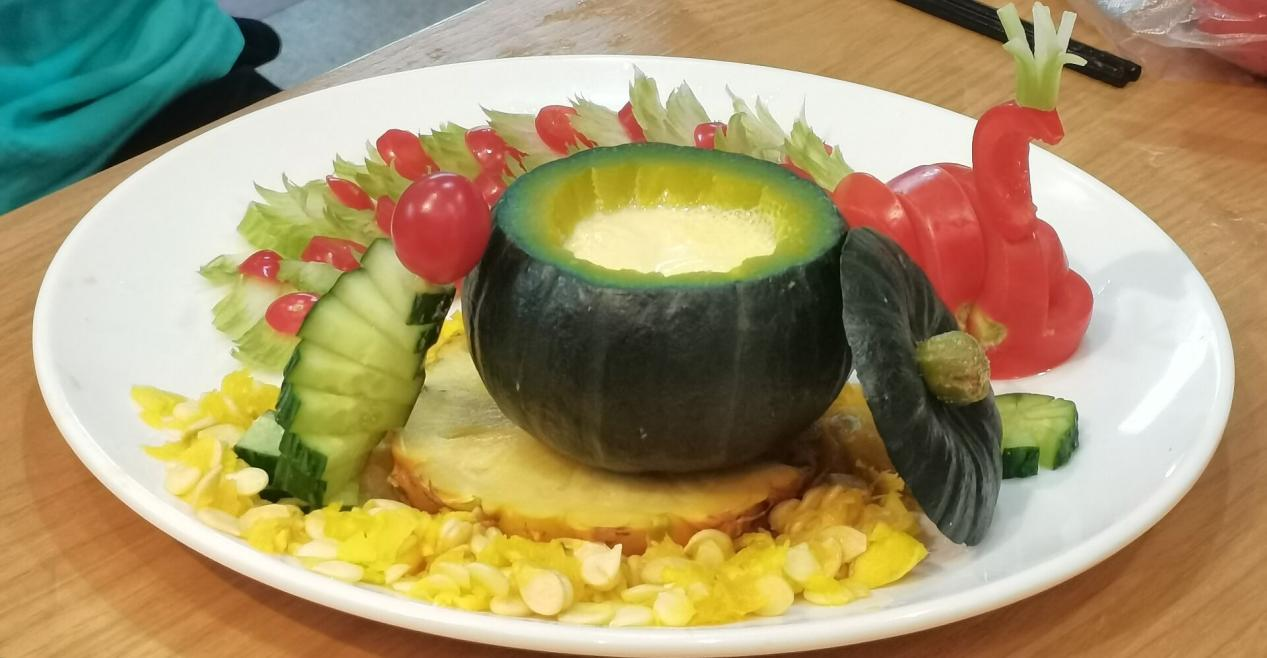 半环状的番茄旋转、扭曲变形并用竹签固定,在顶部镶上一片芹菜叶,便做成了凤身,芹菜与圣女果的完美穿插构成了惟妙惟肖的凤尾,掏空了的南瓜中间盛放着牛奶鸡蛋羹,下面由菠萝片和南瓜籽作“巢”底,这些元素组成了极具观赏价值的特色菜肴“西芹凤尾”。“这道菜主打绿色健康,外形好看而且营养好吃!”网络与新媒体专业2020(1)班的王永奇介绍到。