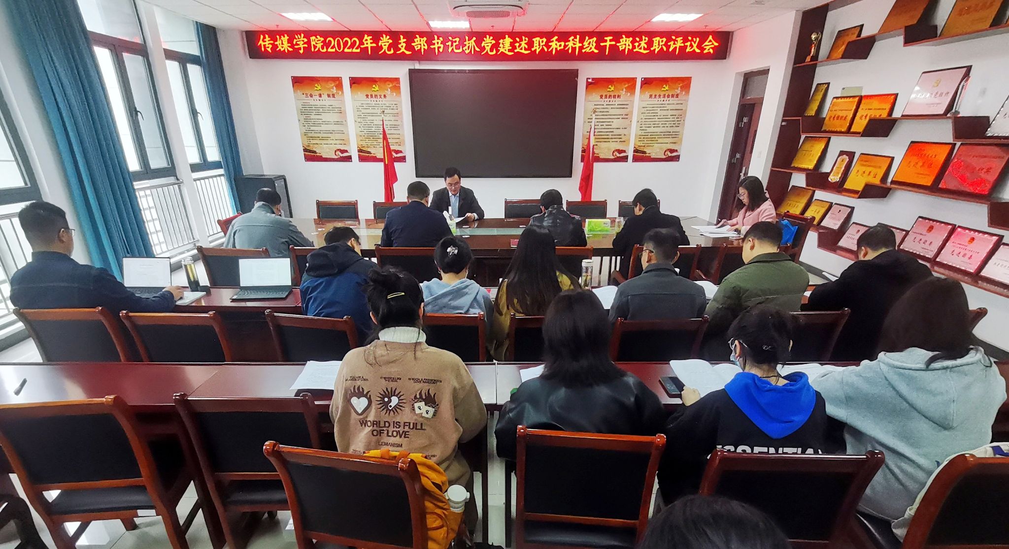 召开2022年度党支部书记抓党建述职和科级干部述职评议会,学院7个党支部书记和5位科级干部一一进行了现场述职。学院党委委员、纪委委员、各党支部书记、科级干部以及师生代表参加了现场评议考核。会议由学院党委书记詹德全主持。