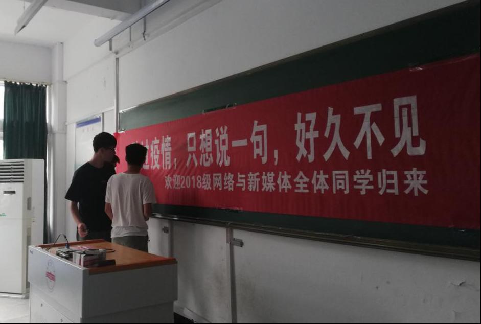 举办“返校第一课”主题教育活动,活动由学院党总支副书记张万茂主持。“跨过疫情,只想说一句,好久不见”,学生刚进教室,就能看见长长的红色横幅上的这句话。横幅内容是辅导员老师精心挑选的,最能代表辅导员老师的心里话。