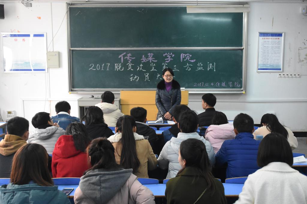 召开2017年下半年脱贫攻坚第三方监测评估动员会,党总支书记陈秀做动员讲话,学院2名带队老师和13名学生代表参加。