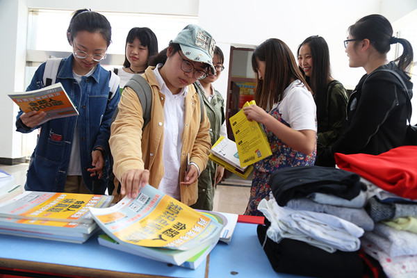 正在为考研做准备的广播电视学2014级孙燕婉,在活动现场精心挑选了4本与政治有关的教辅资料,“学长学姐留下来的这些资料对我们考研很有帮助,我很感谢他们。”她认为,这是一个很温暖的活动,寄托着学长与学姐真挚的关怀,明年她也想捐赠和分享一些书籍、笔记,作为一种爱的接力。(文/学生记者 汪艳 郭永生 图/学生记者 刘敏)