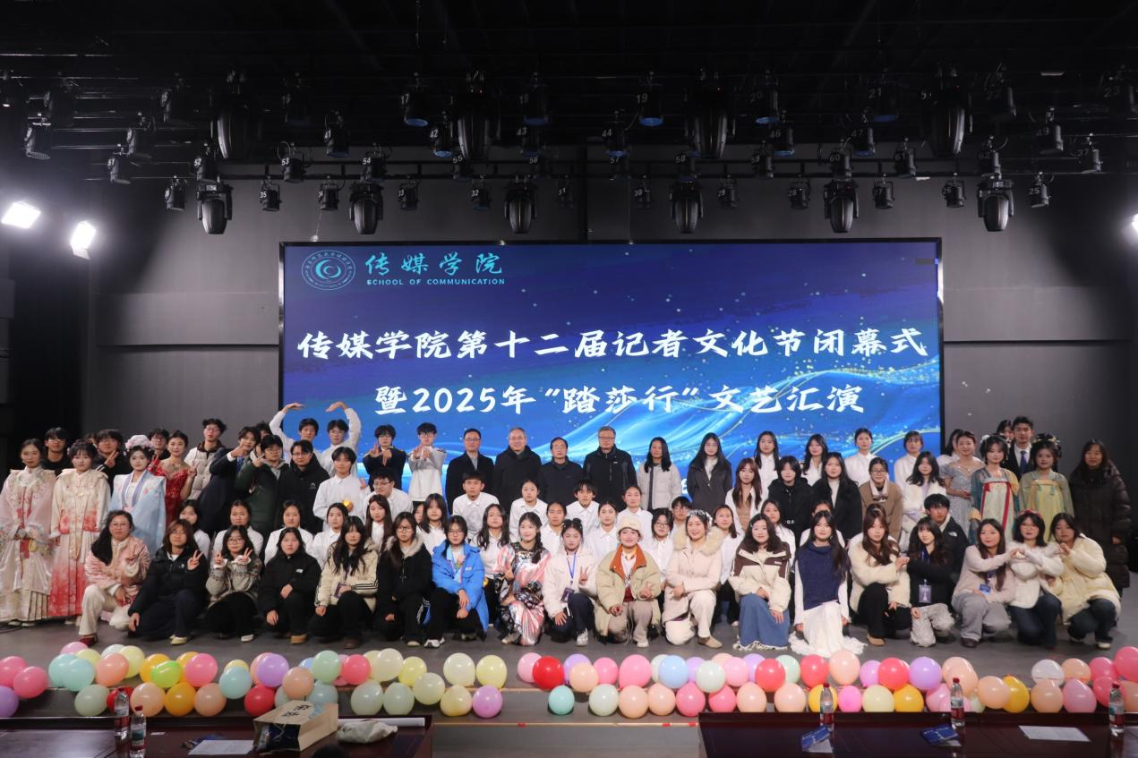 第十二届记者文化节闭幕式暨2025年“踏莎行”文艺汇演在演播厅举办。学院党委书记詹德全、执行院长王业明、党委副书记李元、副院长文继奎、邵敏和部分教师出席,100余名学生观看了演出。