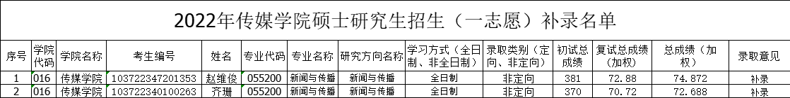 根据学校研究生招生工作领导小组决定,夫妻论坛 新闻与传播专业调控增加2名招生指标,根据《夫妻论坛 2022年硕士研究生招生复试录取办法》《夫妻论坛 学院2022年硕士研究生招生复试录取工作实施细则》等文件要求,现决定按成绩递补拟录取2名考生,现公示如下,公示时间从2022年4月20日开始,公示为期10天。如有问题,请及时向学校研究生复试录取督查组反映,电话:0556-5300053,邮箱:[email protected]。
