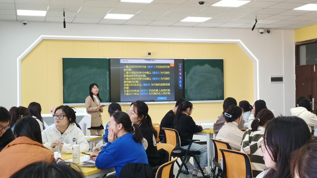 10月18日上午,卓雅老师的《电视作品分析》公开课在D306智慧教室举行。卓雅首先带领学生回顾了上次课程内容,简洁介绍了真人秀的界定与类型,随后梳理了中国电视综艺的发展,并在“雨课堂”设置相关问题,限时作答,增加了课堂的互动性。她最后以《中餐厅》第三季为例,回顾真人秀的构成要素以及如何评析真人秀。