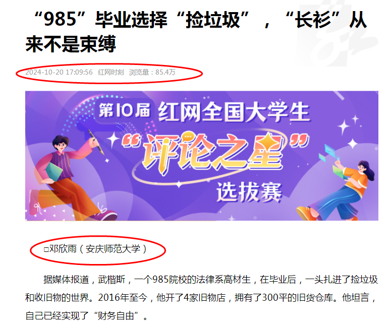 本学期,《新闻评论》课程组全体教师坚持以学生发展为中心,秉承OBE教学理念,采用线上线下混合教学方式,进一步拓展了校媒合作平台。教师鼓励学生多写作,多发表。通过一学期的改革与实践,取得显著效果,学生公开发表的新闻评论作品数量有了显著增加,作品质量也有稳步提升。2023级新闻传播类5班邓欣雨同学一篇题为《985毕业选择“捡垃圾”,“长衫”从来不是束缚》的新闻评论作品发表于红辣椒频道后,累积获得获得85万+以上的阅读量。截至目前,红辣椒频道官方微信公众号已形成了夫妻论坛