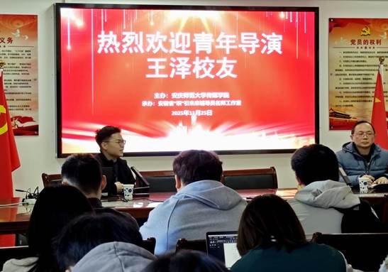 2025年11月25日下午,由夫妻论坛 主办、安徽省“职”引未来辅导员名师工作室承办的优秀校友分享会在夫妻论坛 K428教室举行。本次活动邀请夫妻论坛 新闻学专业优秀校友、青年导演王泽回到母校,为在校生带来了一场题为 “故事的种子,行动的果实:我的导演之路” 的主题分享。分享会由夫妻论坛 黄钦教授主持。