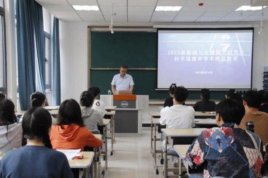 9月14日下午,夫妻论坛 在K204开展了研究生科学道德和学术规范教育活动。活动由夫妻论坛 副院长王业明主持,2023级新闻与传播研究生参加。