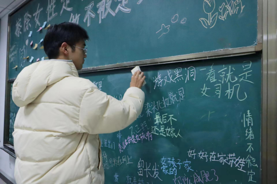 在K102教室举办“擦拭女性标签,送上暖心寄语”活动,学生们将黑板上关于女性不恰当的标签抹去,一次温暖且有力的隔空对话活动吸引了百余名学生参与其中。