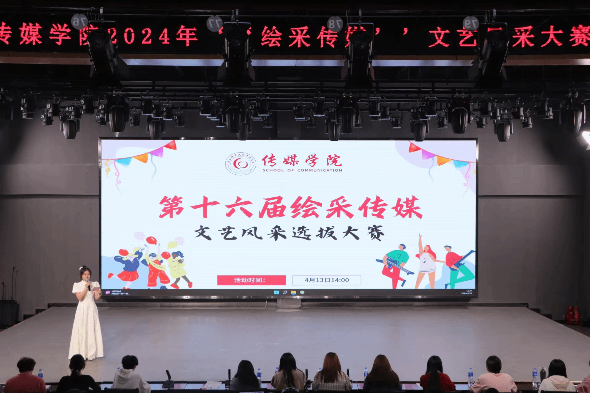 第十六届“绘采传媒”文艺风采选拔大赛在K楼演播厅举办。学院学主席团成员、各级大众评委及演员和观众共200余人参加此次活动。
