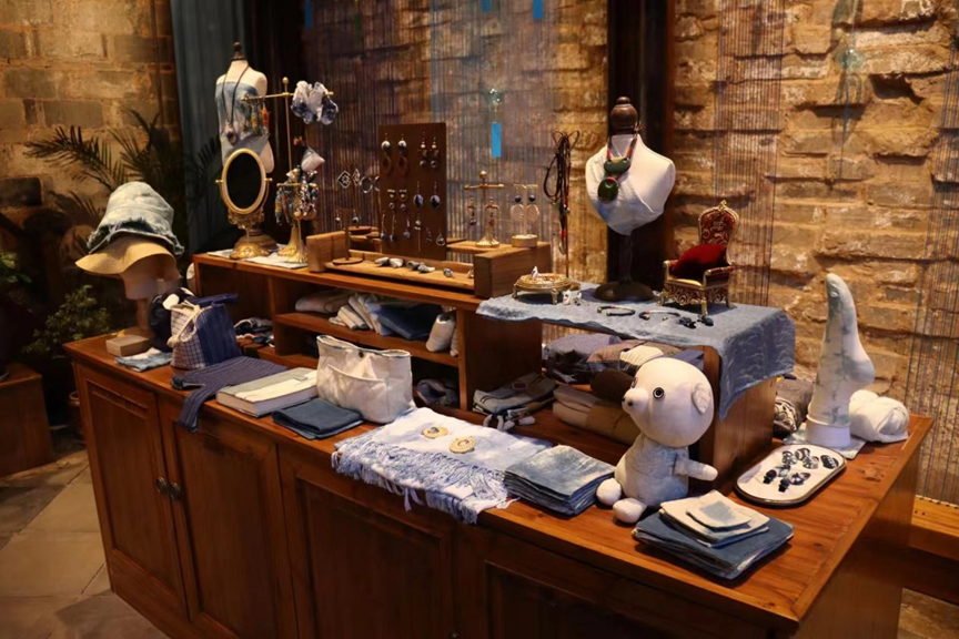 调研走访时,实践团成员们发现了一方艺术天地。木质的家居,暖色的灯光,随处可见的蓝染工艺品……蓝屋艺术馆的每一隅都很“出片”。首饰、布包、衣物……艺术馆里展示着各式各样的蓝染工艺品。